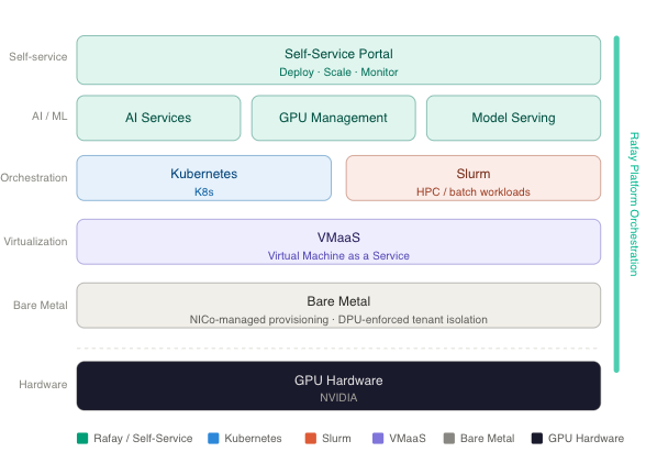 NICo provides the hardware automation layer. Rafay sits on top of NICo's host-based networking model and uses it as the foundation for delivering multi-tenancy at scale — without the operational overhead that traditionally limits how many tenants a team can serve.