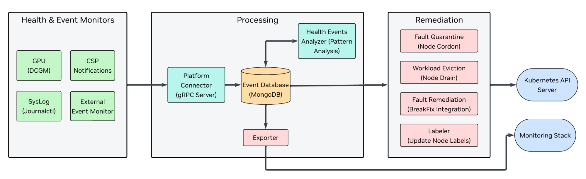 Acts as the central hub, receiving health events from all monitors via gRPC, persisting them to MongoDB, and updating Kubernetes node conditions based on GPU health status.