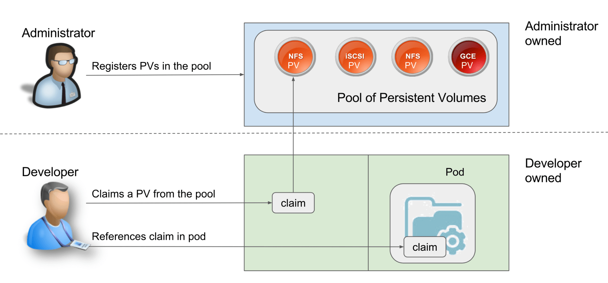 - Developer configures a Pod to use the PV based on the satisfied claim.