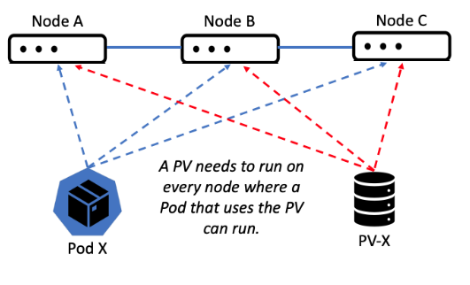 Note that the definition specifies a variety of aspects about the PV such as its name, capacity, access modes, etc.It’s helpful to think about how a simple three-node Kubernetes cluster operates to understand what is expected of a PV. Kubernetes containers run in Pods. During normal operations, Pod X running on Node A might stop and be restarted on Node C or Node B, so any PV it’s associated with (PV-X in the diagram below) will need to be accessible from every node where the Pod can run. Often that means it will need to be accessible on all nodes in the cluster. And, of course, you need to have methods to create PVs and a way for application containers running in pods to consume them.