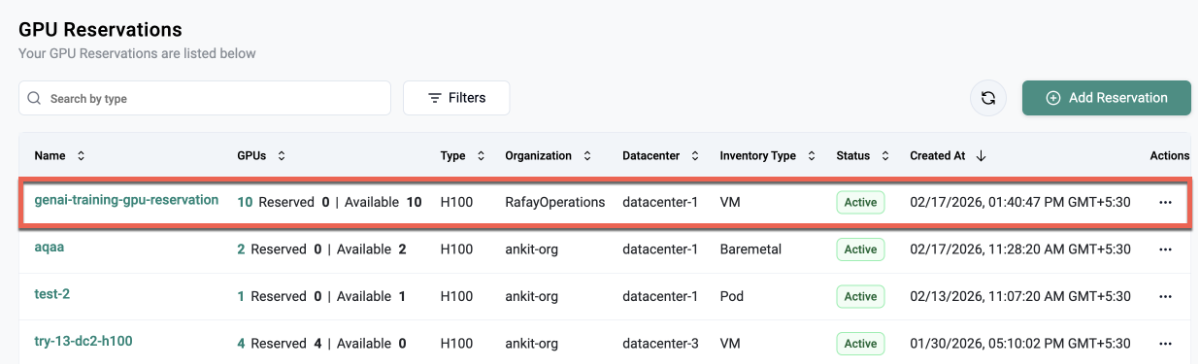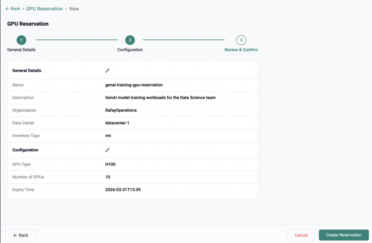 Enterprise AI teams operate under strict cost controls. To support this, Rafay allows you to configure reservations so that customers cannot consume beyond their reserved allotment. This is an opt-in guardrail, but for customers who need hard budget ceilings on GPU spend especially those running multi-month training workloads it's an essential feature.