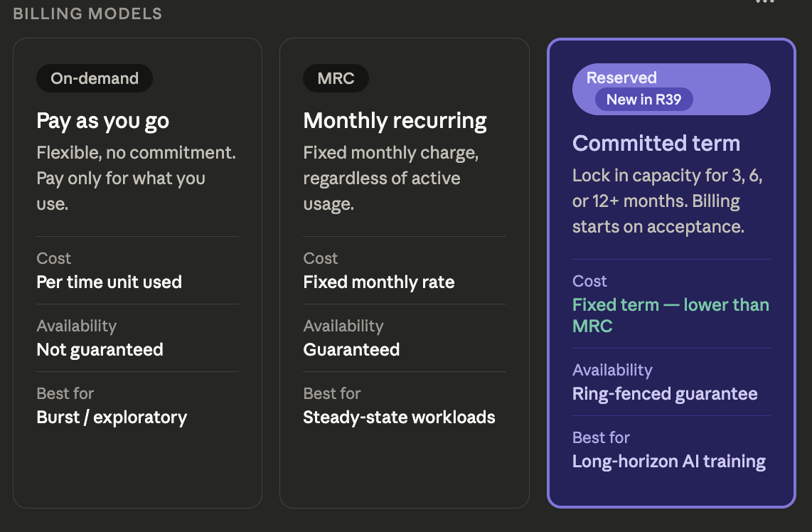 Together, these three models give you, the GPU cloud provider, the tools to serve every type of customer, from developers spinning up a quick experiment to enterprises running months-long model training workloads.