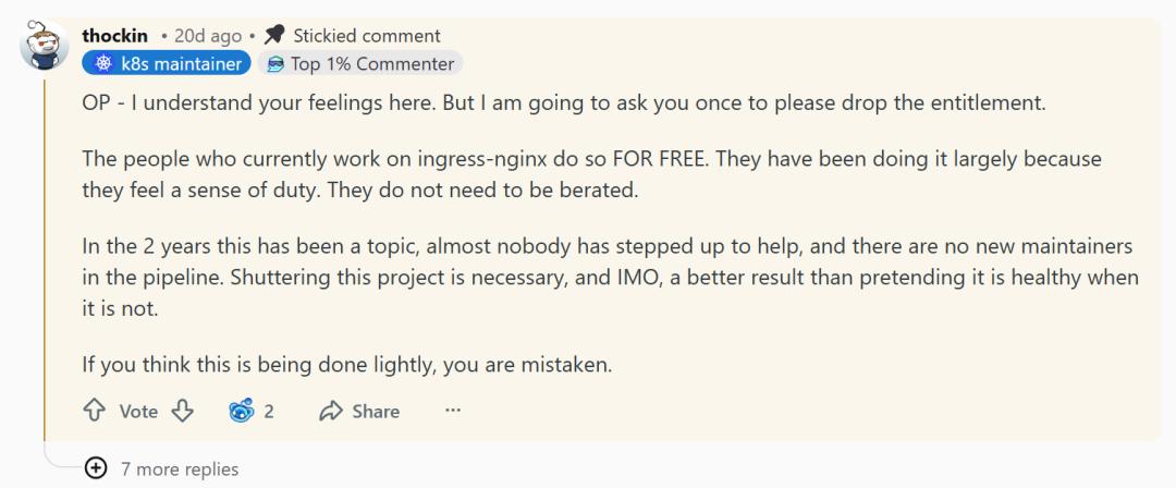 For years, Ingress NGINX was effectively maintained by one or two volunteers, largely in their spare time. That’s a brutal model for something that sits directly on the edge of thousands of production clusters. Eventually, the responsible thing to do was to stop pretending this was sustainable and set a clear end-of-life timeline.