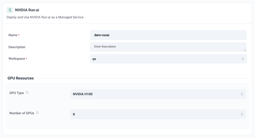 In short, transforming NVIDIA Run:ai into a cloud-managed service allows GPU Clouds to deliver value added services in a scalable way. The experience begins in the GPU Cloud provider’s marketplace or self-service portal. Customers simply choose the NVIDIA Run:ai service, which can supports variations like: