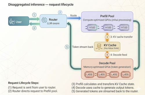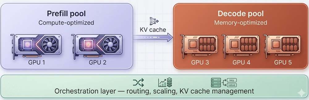 Disaggregated inference takes a fundamentally different approach. It separates the prefill and decode phases onto dedicated, independently scalable pools of GPUs. Compute-optimized GPUs handle the prefill phase, while memory-optimized GPUs handle decode. An orchestration layer manages the transfer of the KV cache between pools and routes requests intelligently.