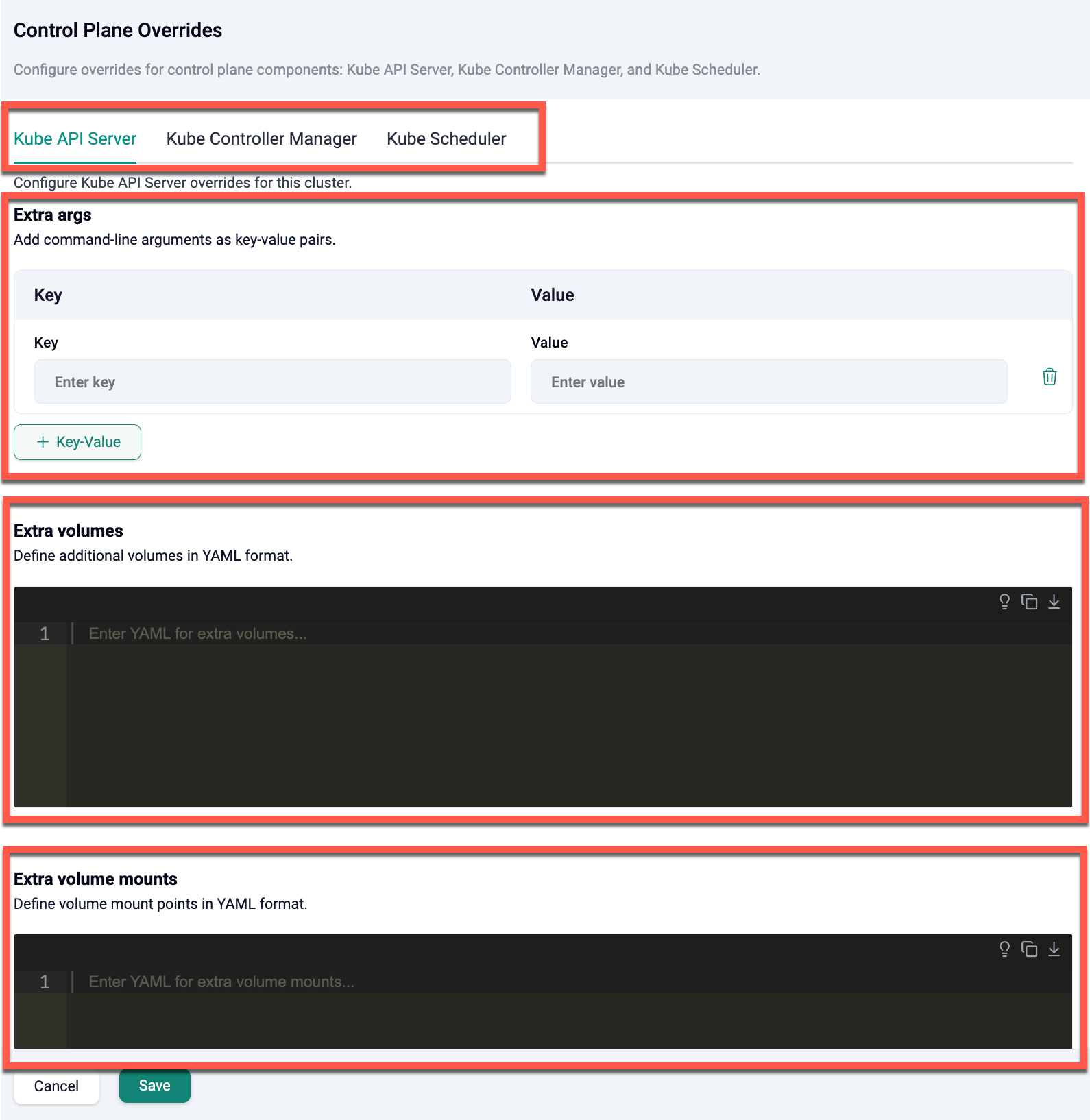 For each of the three control plane components — Kube API Server, Kube Controller Manager, and Kube Scheduler — you can now configure:
