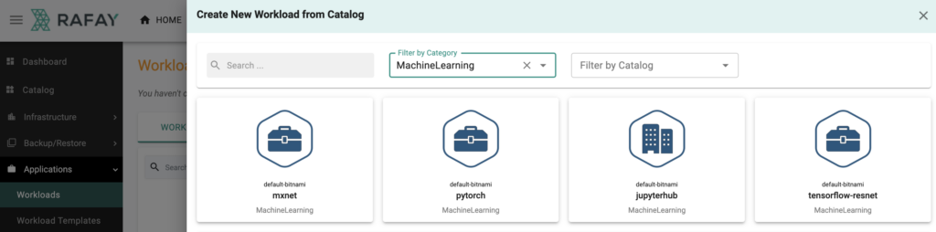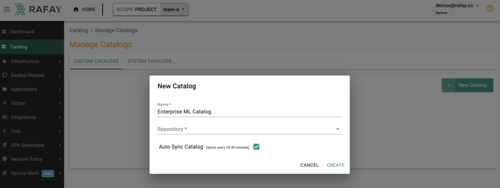 Our customers use custom app catalogs to curate pre-validated applications. With this, the data scientists can just click to deploy and use complex ML apps on Kubernetes clusters. Shown below is a screenshot showing what the creation of a custom app catalog looks like for a platform engineer.