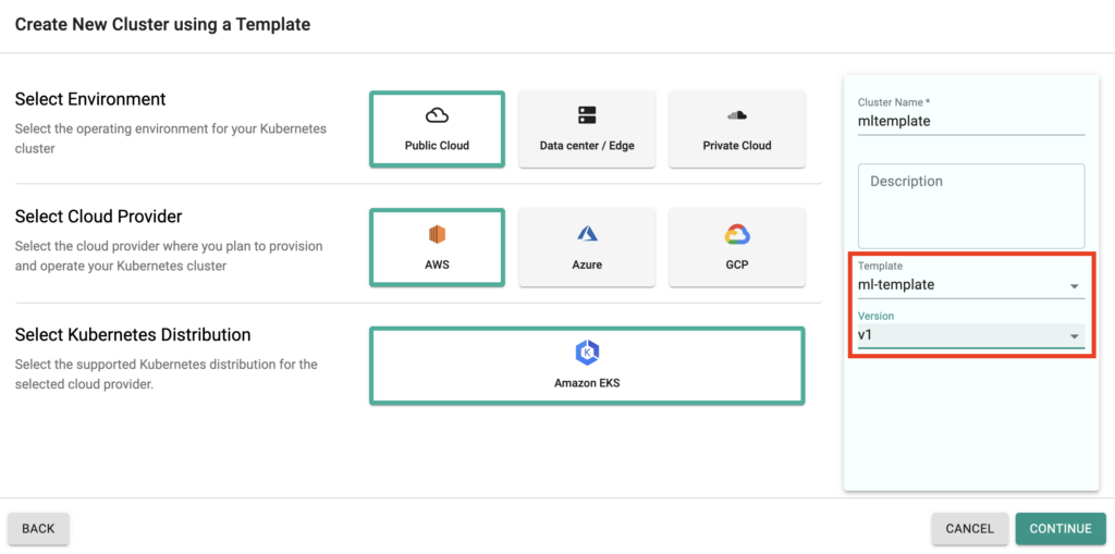 Using pre-validated cluster templates, data scientists can literally provision complete Kubernetes based operating environments for AI/ML based on Kubernetes with a click of a button.
