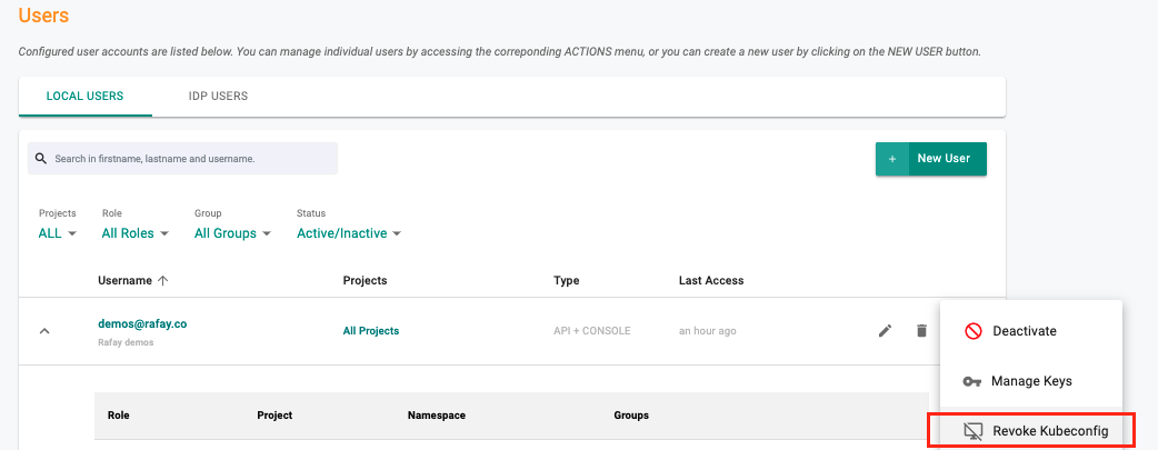 There may be cases where a user no longer requires kubectl access or the kubeconfig file may have been compromised (e.g., lost/stolen laptop). It is straightforward from within Rafay’s platform to revoke a specific user’s kubeconfig immediately. Note that this can be done centrally across clusters i.e., it is not required to do this cluster by cluster.More information available here.